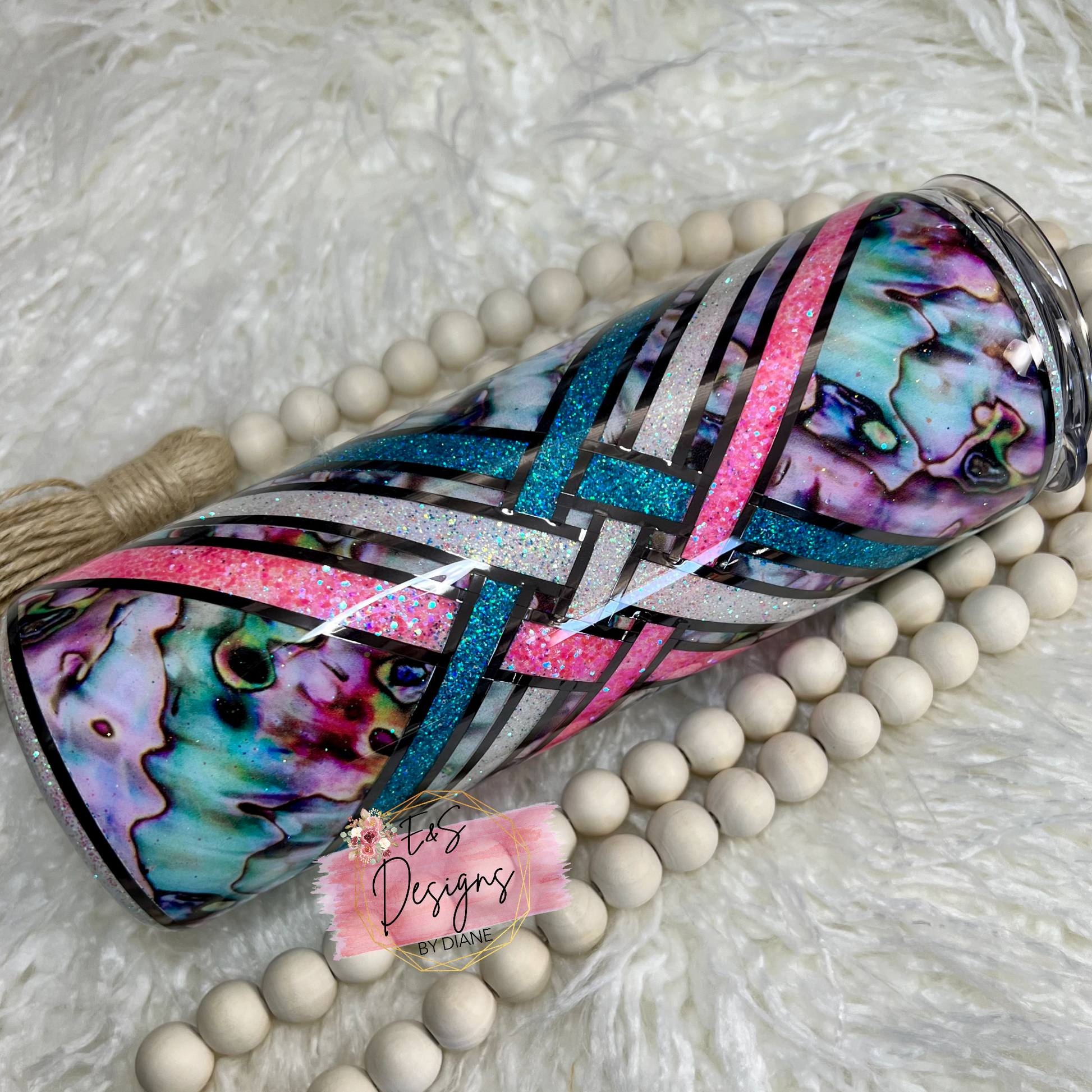 This stainless steel, double-walled 20oz Skinny Straight Tumbler keeps drinks hot and cold. The design features an abstract beach shell vinyl and basket weave glitter style