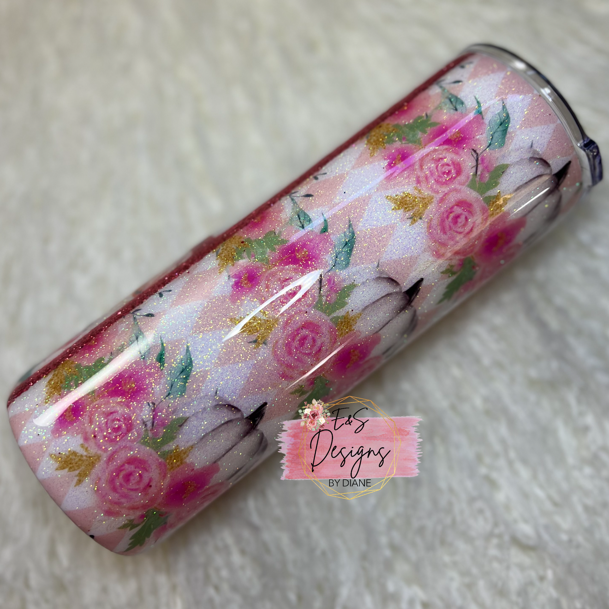 This stainless steel, double-walled 20oz Skinny Straight Tumbler keeps drinks hot and cold. The design features the cutest gnome and pumpkins