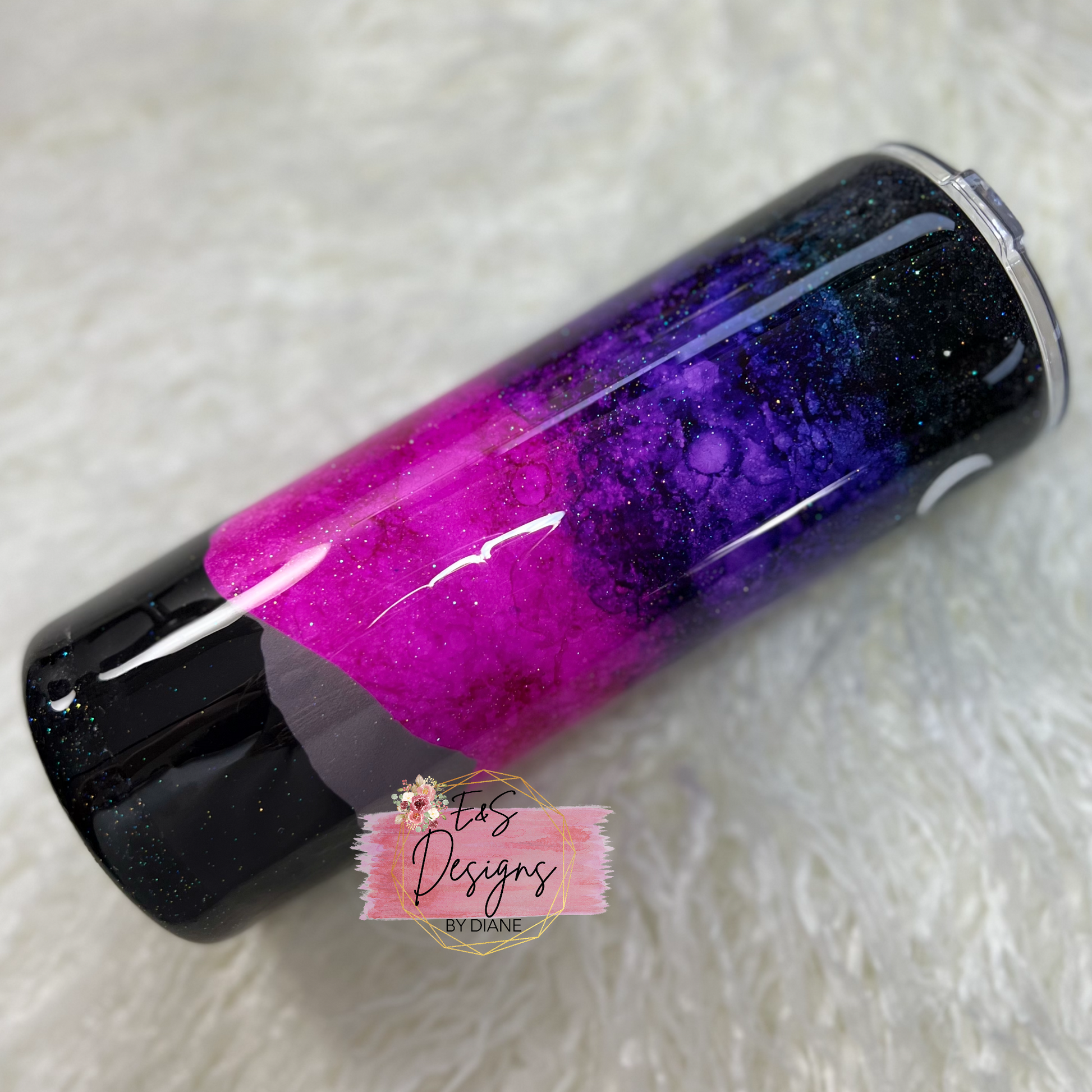 This stainless steel, double-walled 24oz Plump Tumbler keeps drinks hot and cold. The design features alcohol inks