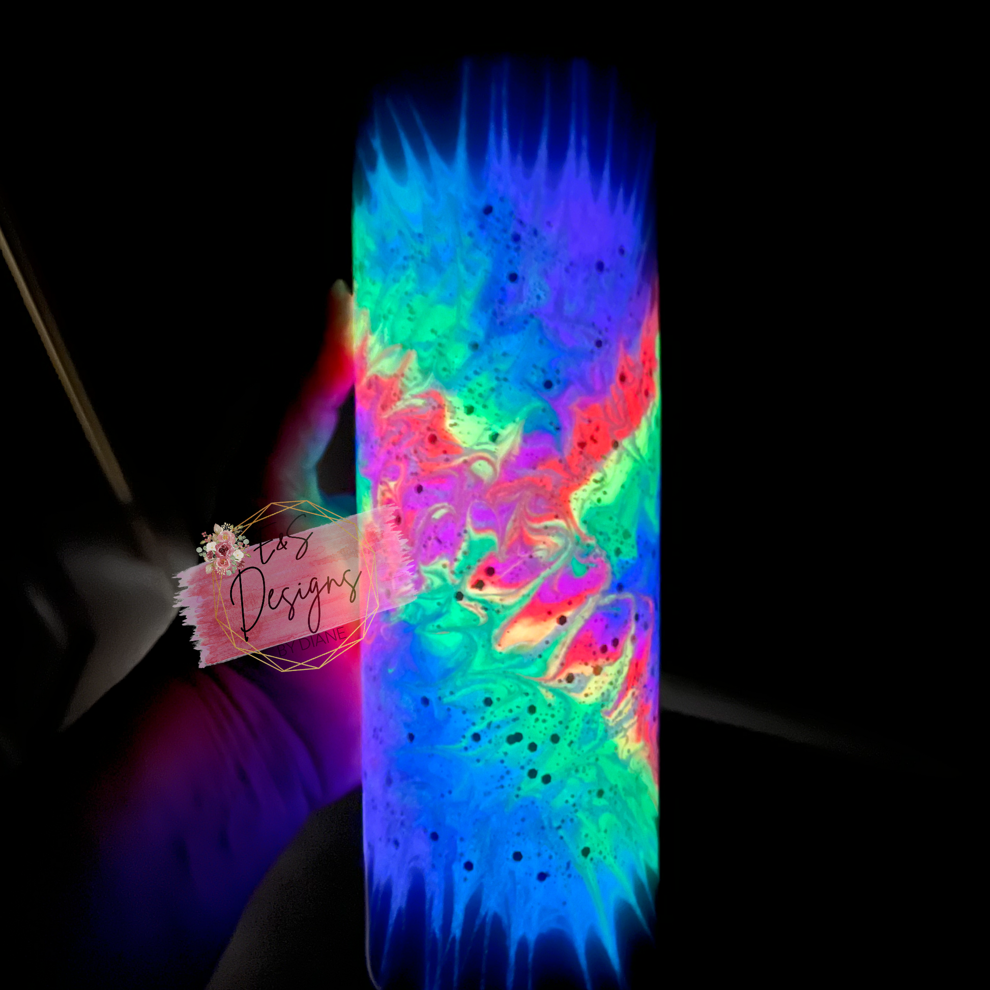 This stainless steel, double-walled 30oz Skinny Straight Tumbler keeps drinks hot and cold. The design features a pigment boujie technique that glows in the dark when charged in the sunlight