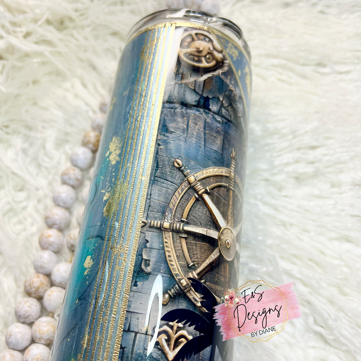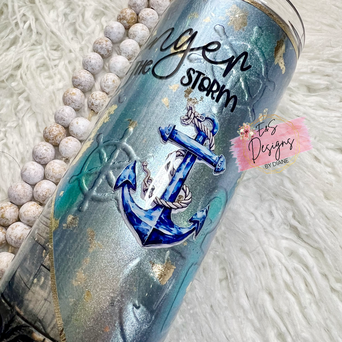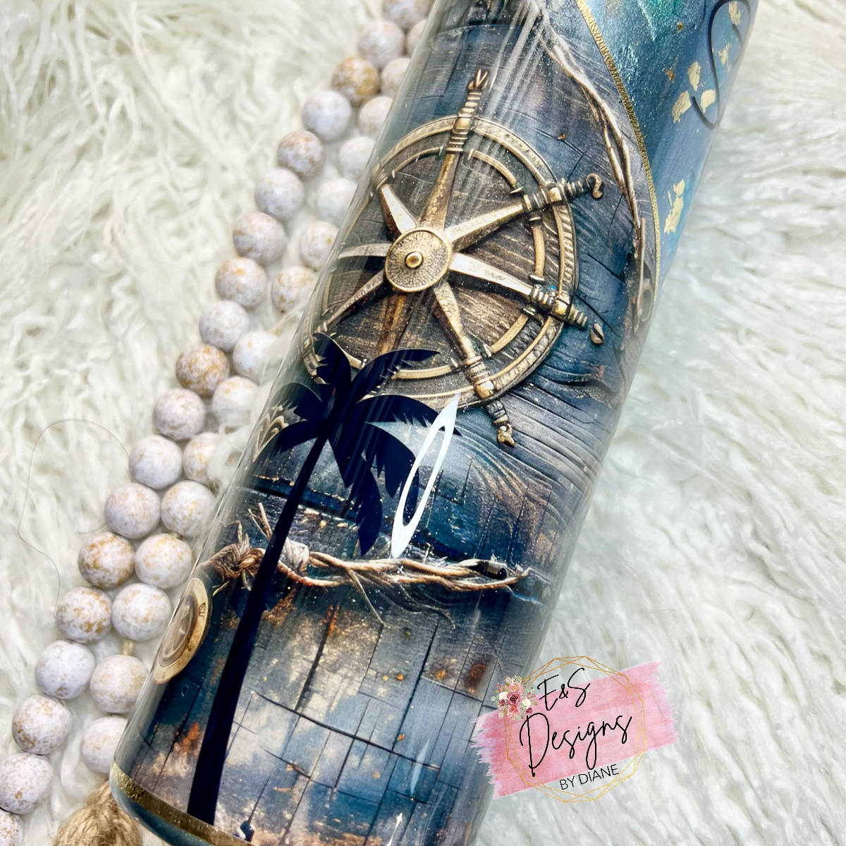 This stainless steel, double-walled 30oz Skinny Straight Tumbler keeps drinks hot and cold. The design features a beach style anchor inspired theme