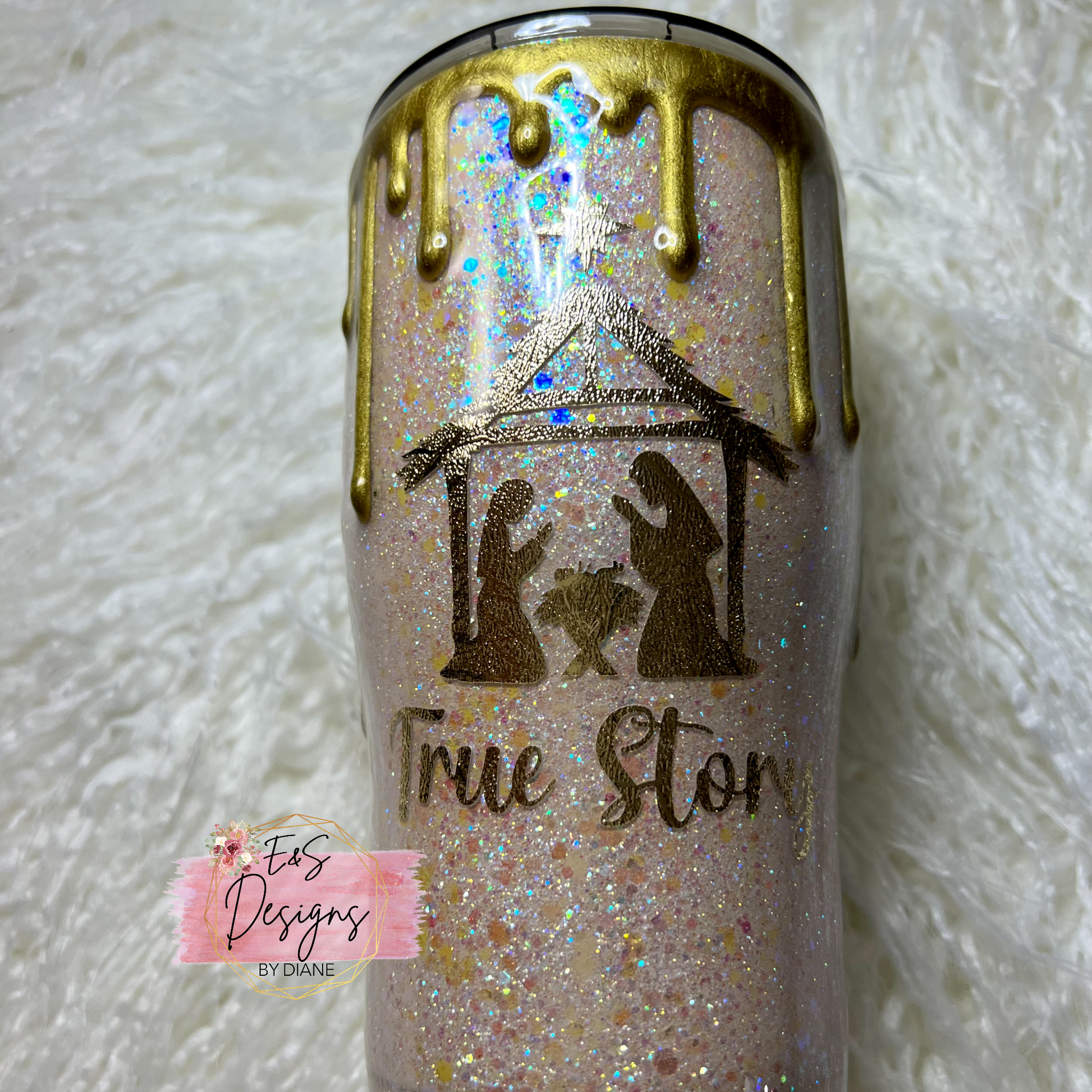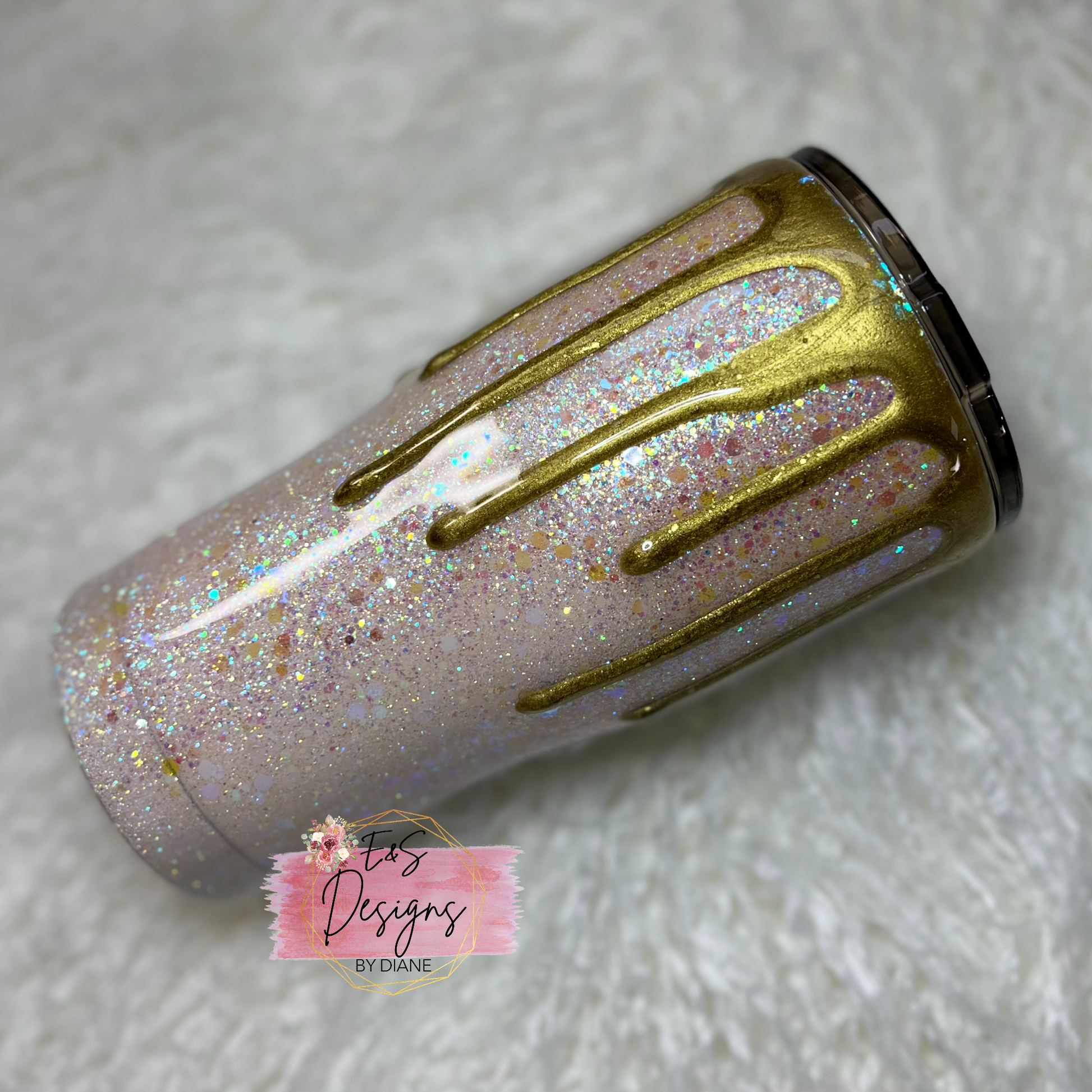 This stainless steel, double-walled 20oz Modern Curve Tumbler keeps drinks hot and cold. The design features full glitter and a drip