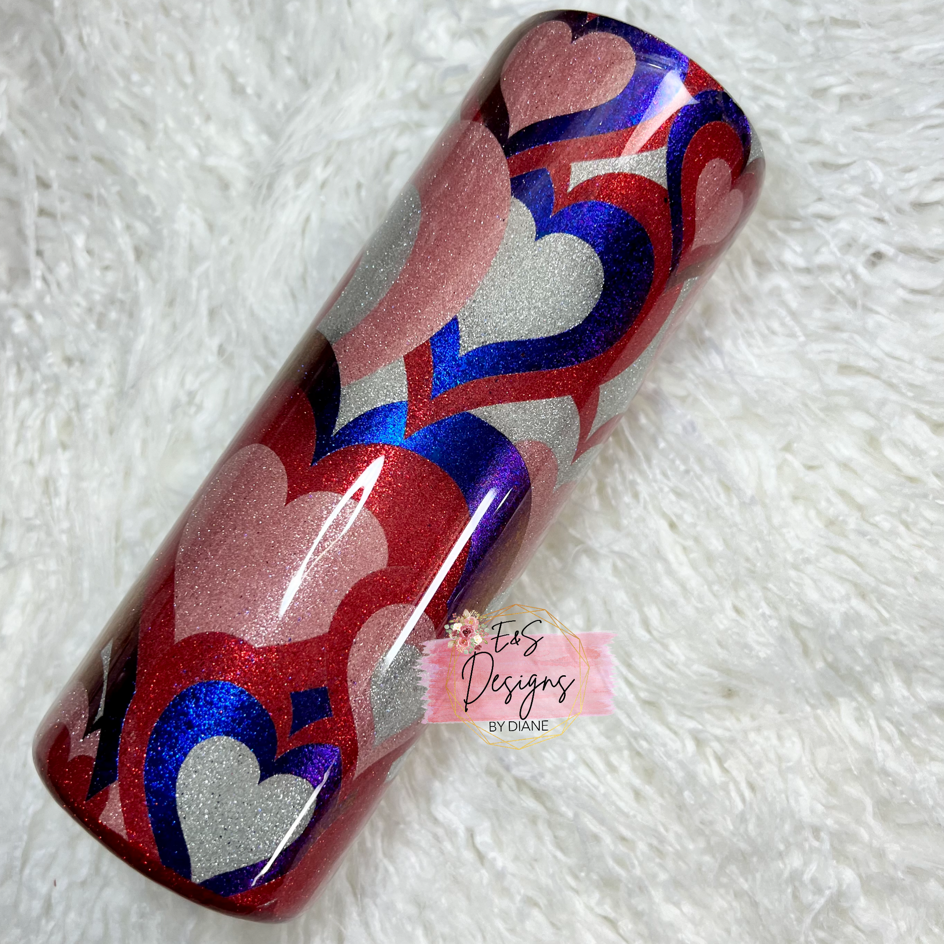 This stainless steel, double-walled 20oz Skinny Straight Tumbler keeps drinks hot and cold. The design features a Valentines Theme