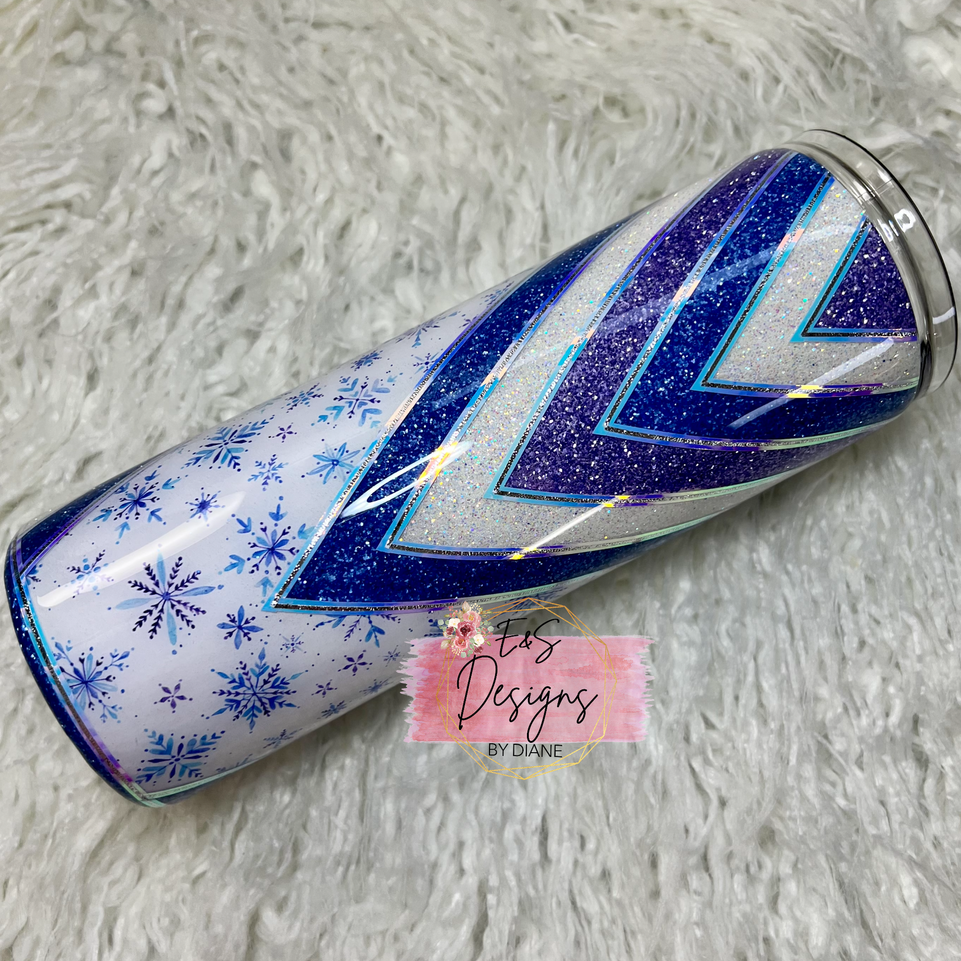 This stainless steel, double-walled 20oz Skinny Straight Tumbler keeps drinks hot and cold. The design features vinyl and glitter